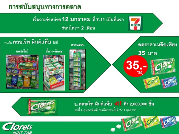 3) กระตุ้นยอดขายด้วยกิจกรรมส่งเสริมการขายแบบเต็มสูบ แจกตัวอย่างผลิตภัณฑ์กว่า 2 ล้านชิ้น ณ เซเว่น อีเลฟเว่น ทุกสาขาทั่วประเทศไทย ในวันที่ 4 กุมภาพันธ์ เพื่อมอบประสบการณ์ให้แก่ผู้บริโภคก่อนวางขายจริง พร้อมเติมเต็มสื่อสนับสนุนในร้านค้าให้ผู้บริโภคเห็นคลอเร็ทได้ง่าย ทั้งยังเสริมด้วยโปรโมชั่นราคาพิเศษในช่วงเปิดตัวอีกด้วย