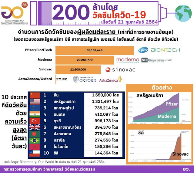 ➡️(21 กุมภาพันธ์ 2564) ศาสตราจารย์ ดร. นายแพทย์สิริฤกษ์ ทรงศิวิไล ปลัดกระทรวงการอุดมศึกษา วิทยาศาสตร์ วิจัยและนวัตกรรม (อว.) เผยว่า "ขณะนี้ยอดการฉีดวัคซีนโควิด-19 ทั่วโลก ได้เกินกว่า 200 ล้านโดสแล้ว นับเป็นวัคซีนที่พัฒนาเร็วที่สุดและฉีดในประชากรจำนวนมากที่เร็วที่สุดในประวัติศาสตร์ โดยมีกว่า 88 ประเทศที่ได้รับวัคซีนแล้ว ในอัตราการฉีดล่าสุดรวมกันทั่วโลกที่ 6.35 ล้านโดสต่อวัน ประเทศที่ได้รับวัคซีนแล้วส่วนใหญ่จะเป็นกลุ่มประเทศรายได้สูง”