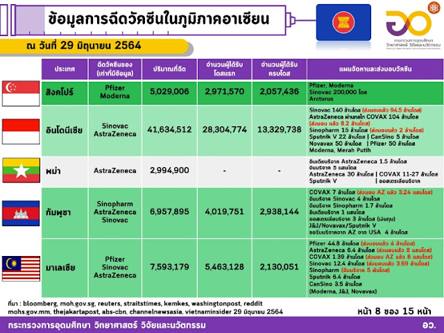 "อว. เผยฉีดวัคซีนของไทย ณ วันที่ 29 มิถุนายน ฉีดวัคซีนแล้ว 9,416,972 โดส และทั่วโลกแล้ว 2,976 ล้านโดส ใน 201 ประเทศ/เขตปกครอง ส่วนอาเซียนฉีดแล้วทุกประเทศ รวมกันกว่า 88.726 ล้านโดส โดยจังหวัดของไทยที่ฉีดมากที่สุด คือ จังหวัดภูเก็ต โดยฉีดวัคซีนเข็มแรกกว่า 67.49%”