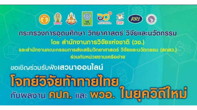 ภายใต้กระทรวงการอุดมศึกษา วิทยาศาสตร์ วิจัยและนวัตกรรม (อว.) ขอเชิญเข้าร่วมฟังเสวนาหัวข้อ “โจทย์วิจัยท้าทายไทยกับผลงาน คปก. และ พวอ. ในยุควิถีใหม่”