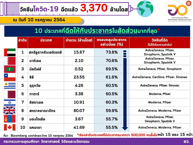 "อว. เผยฉีดวัคซีนของไทย ณ วันที่ 10 กรกฎาคม ฉีดวัคซีนแล้ว 12,375,904 โดส และทั่วโลกแล้ว 3,370 ล้านโดส ใน 201 ประเทศ/เขตปกครอง ส่วนอาเซียนฉีดแล้วทุกประเทศ รวมกันกว่า 110.551 ล้านโดส โดยจังหวัดของไทยที่ฉีดมากที่สุด คือ ภูเก็ต โดยฉีดวัคซีนเข็มแรกกว่า 71.66%”