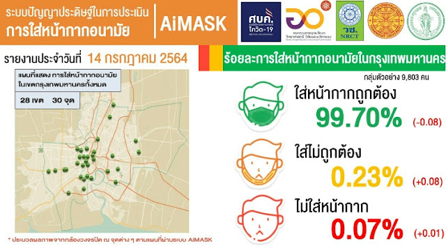 เมื่อวันที่ 14 กรกฎาคม 2564 กระทรวงการอุดมศึกษา วิทยาศาสตร์ วิจัยและนวัตกรรม (อว.) เปิดเผยข้อมูลจากการติดตามการใส่หน้ากากอนามัยของประชาชนในกรุงเทพมหานคร โดยใช้ระบบปัญญาประดิษฐ์ในการประเมินการใส่หน้ากากอนามัย (AiMASK) พบว่าการใส่หน้ากากอนามัยในกรุงเทพมหานคร มีผู้ใส่หน้ากากอนามัยถูกต้อง จำนวน 99.70% , ใส่หน้ากากอนามัยไม่ถูกต้อง จำนวน 0.23% และผู้ที่ไม่ใส่หน้ากากอนามัย จำนวน 0.07%
