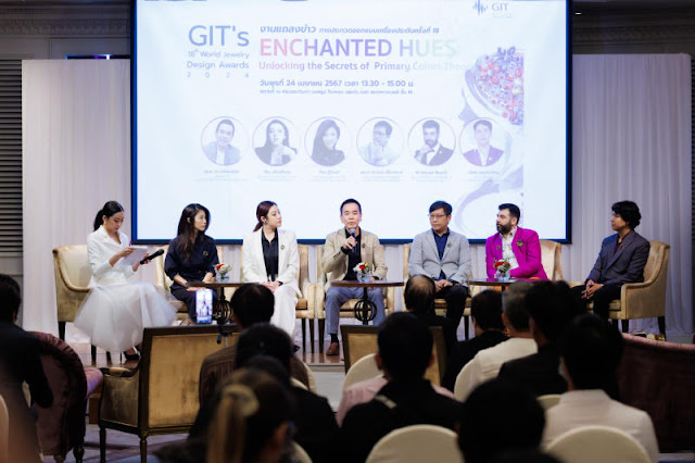 24 เมษายน 2567: GIT จัดการแถลงข่าวโครงการประกวดการออกแบบเครื่องประดับครั้งที่ 18 “Enchanted Hues – Unlocking the Secrets of Primary Colors Theory” เฟ้นหาศักยภาพของนักออกแบบที่มีความคิดสร้างสรรค์โดดเด่นเหนือจินตนาการ พร้อมยกทีมผู้เชี่ยวชาญร่วมตีโจทย์ยกระดับต่อยอดการออกแบบสู่สากล ณ โรงแรม เลอบัว แอท สเตททาวเวอร์ กรุงเทพฯ